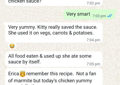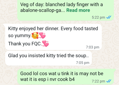 Bonds are formed over time, likewise, understanding customers’ eating habits. Am glad within my small kitchen and my 2 hands, I am able to provide food and comfort and have “Kitty” eat safely and healthily. The same will go for all clients. The heart is what matters…
