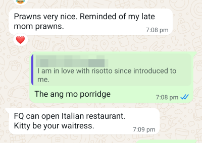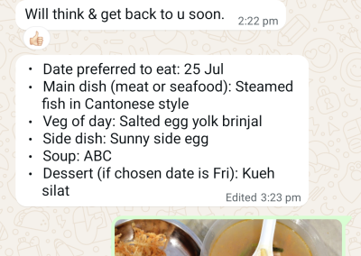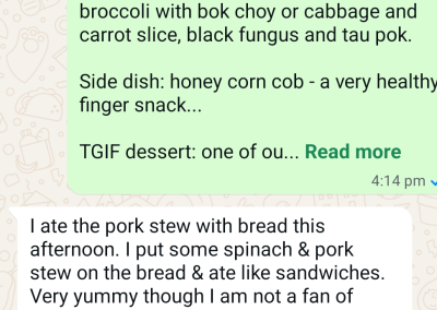 She has always been very supportive, recommending customers, introducing us to her church and church members and whenever any friends has issues and needed tingkat, she always thinks of us first. Am very grateful and whenever she compares us to the food when she eats out on weekends, I am thankful and amused most times… I always tell her “she is definitely biased cos she loves us!” Lol…