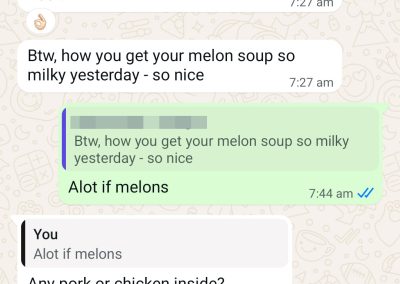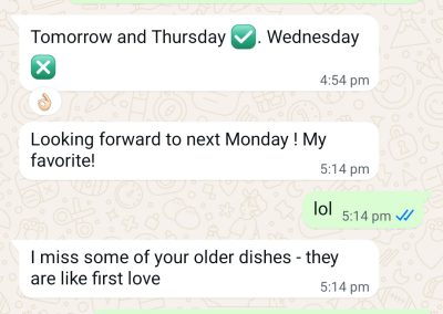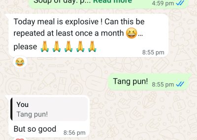 We chat ocassionally and on days that she is on detox, she will skip dinner. I think 1 of the thing I did right was to offer 1pax tingkat – cooking for even 2pax is tough. the ideal size is 4-5pax to be “efficient”.