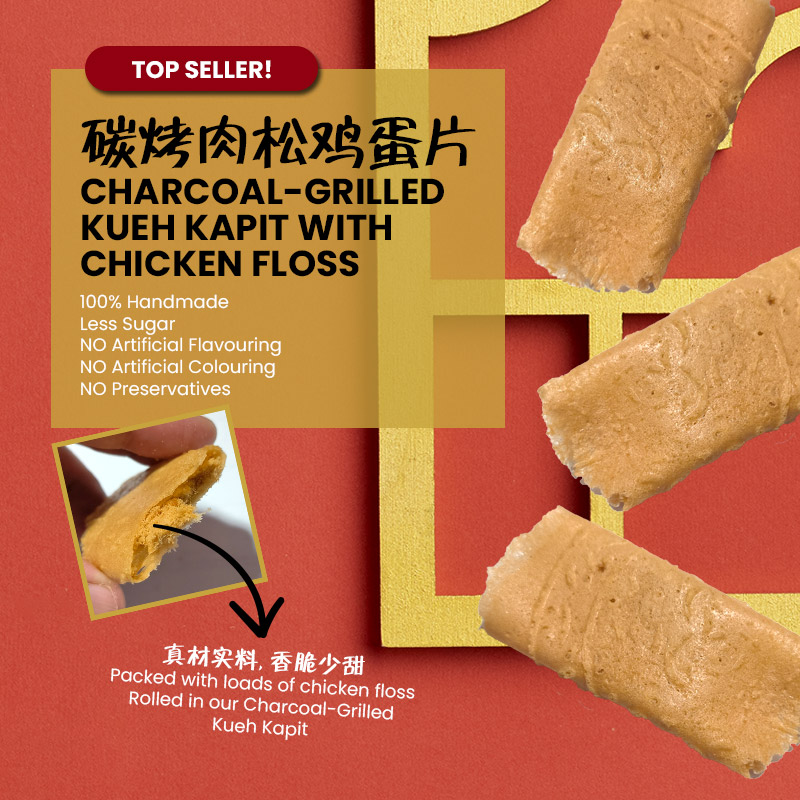 So many of you have requested for our popular Charcoal-Grilled Kueh Kapit to “giap” with chicken floss… so we tried last year and it was a hit!!! Our thin fragrant charcoal-grilled kueh kapit with the savouriness of the chicken floss, me love the pairing!!!