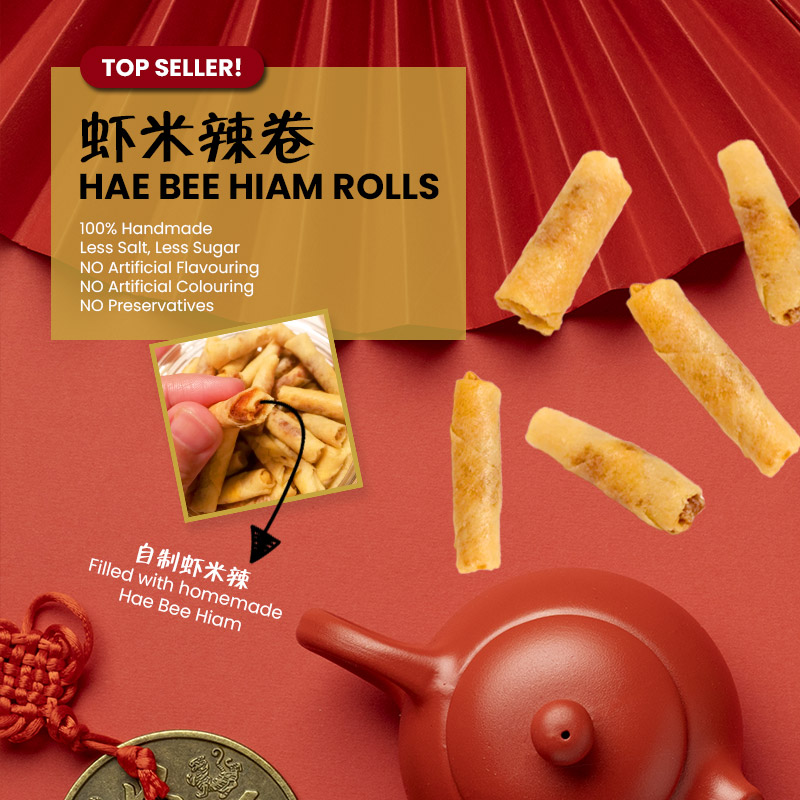 Filled with our popular homemade spicy Hae Bee Hiam (sold in bottles). Only once a year, we will roll these mini yet addictive snacks!