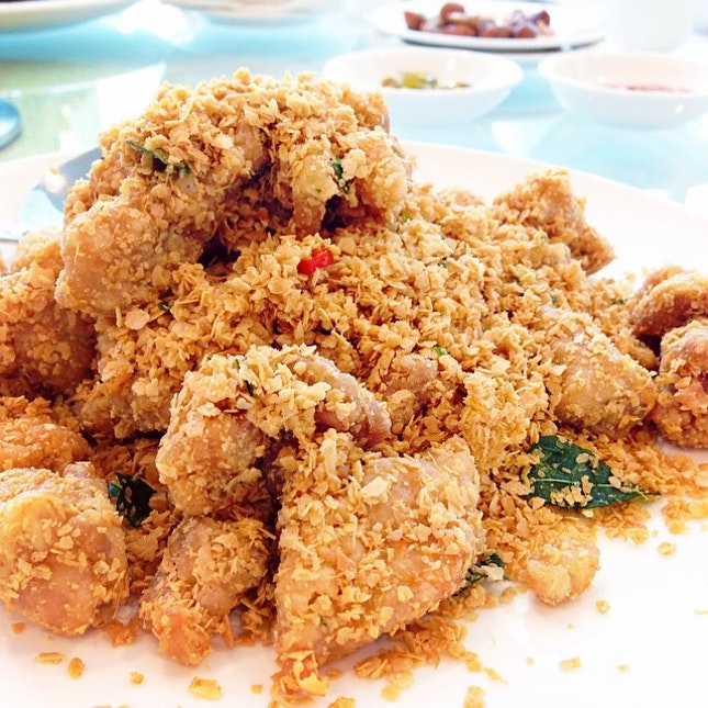 Boneless chicken thigh meat, chunked and deep fried, then sauteed in a sweet-savoury multigrain “Nestum” cereal mix with curry leaves.